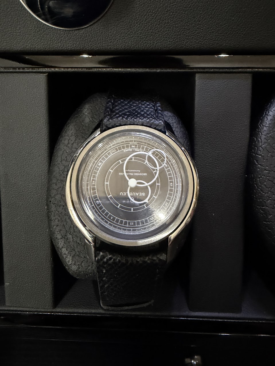 BeauBleu's Seconde Française takes a radical approach: what if watches didn't need hands at all? The French brand's signature piece uses rotating concentric circles to display time—a design that looks more like kinetic art than a traditional timepiece.