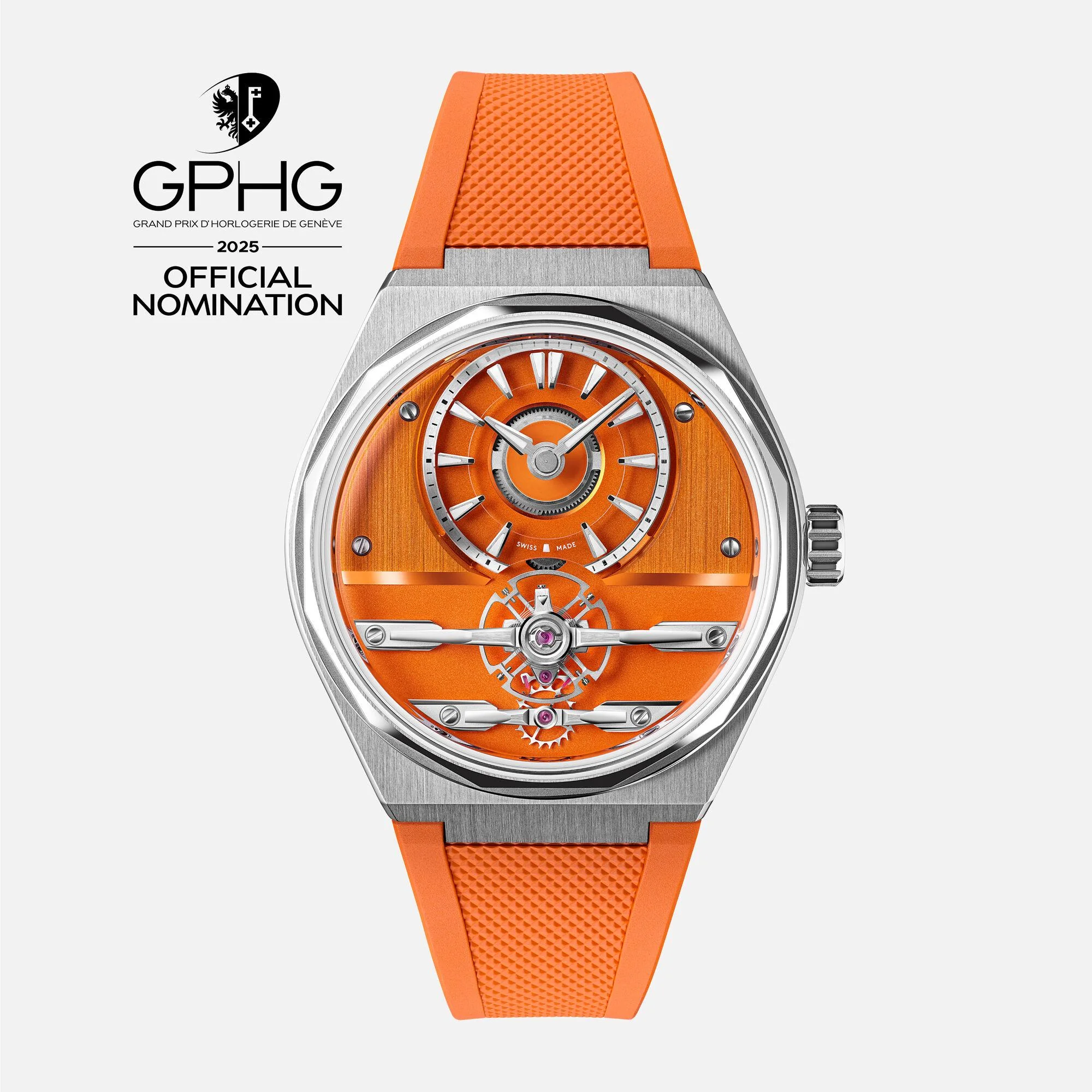 When a microbrand receives GPHG (Grand Prix d'Horlogerie de Genève) Official Nomination—one of watchmaking's highest honors—you know they're doing something right. Heron's Marinor in striking orange showcases exposed movement components, combining vibrant color with mechanical transparency.