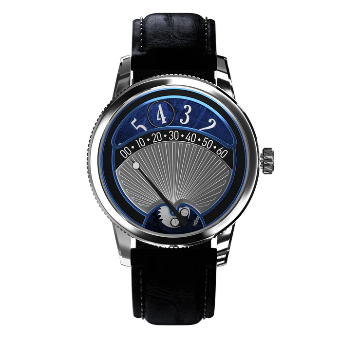 The Azazel takes innovation further with a fan sector display—time is shown through a sweeping fan that opens and closes across the lower dial. This mechanism, more commonly seen in vintage complications, gives the watch kinetic personality as the fan constantly moves.