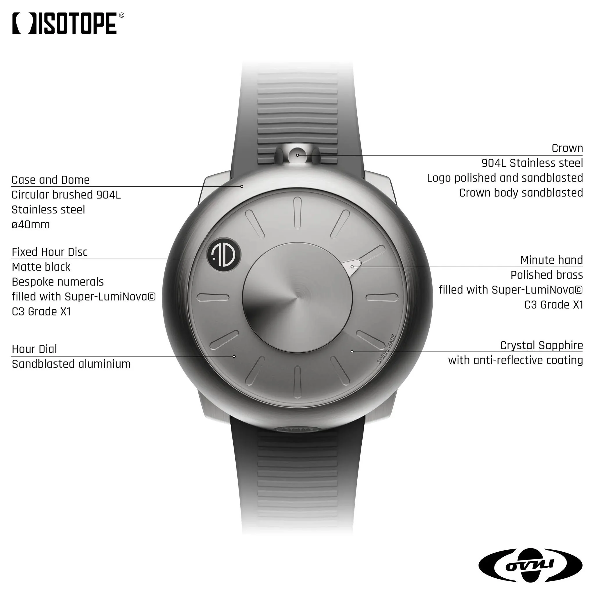 Isotope's OVNI features jumping hour complication—the hour display jumps instantly from one hour to the next rather than moving gradually. This mechanism, typically reserved for high-end luxury pieces, appears in Isotope's accessible price range.